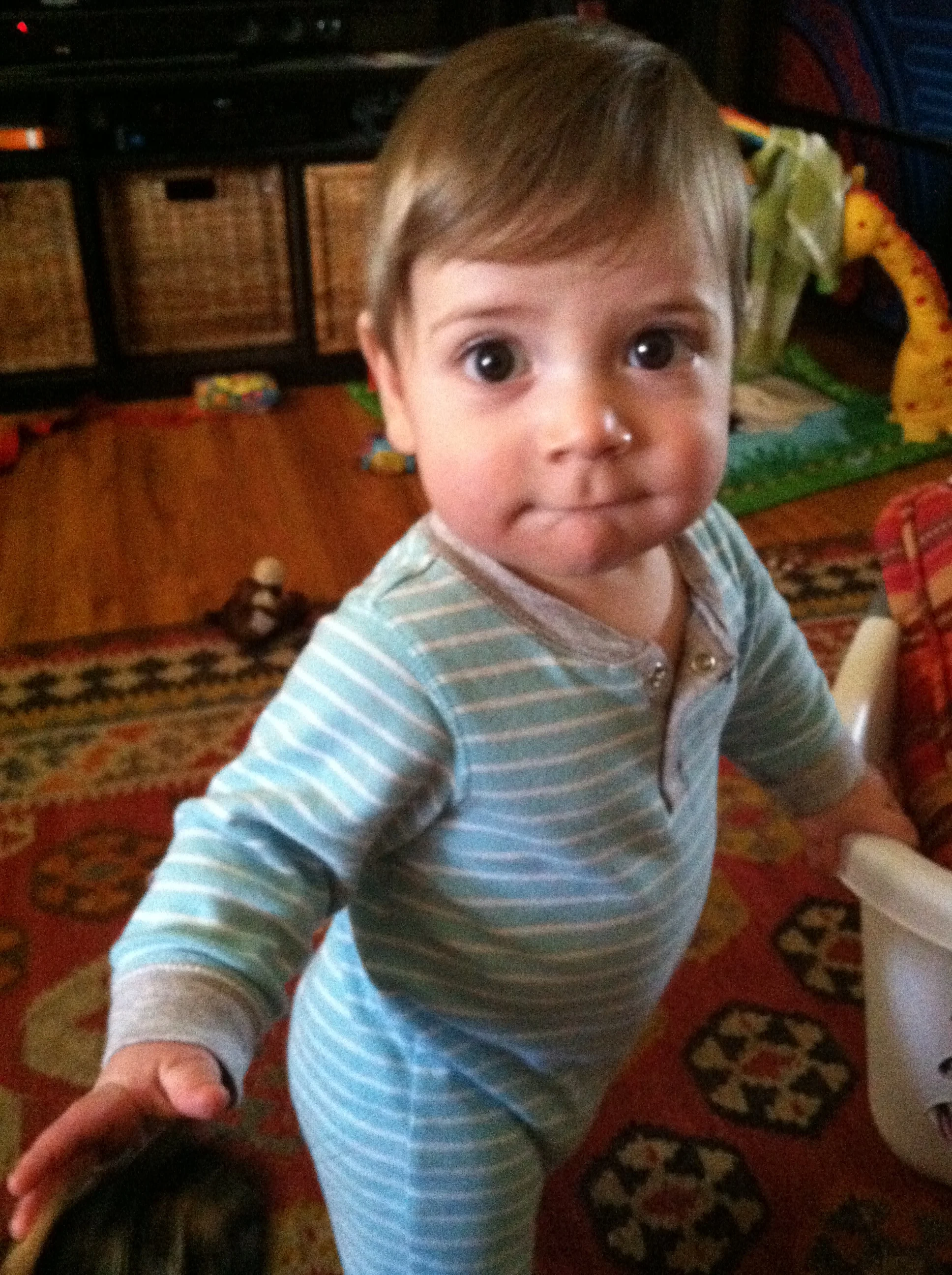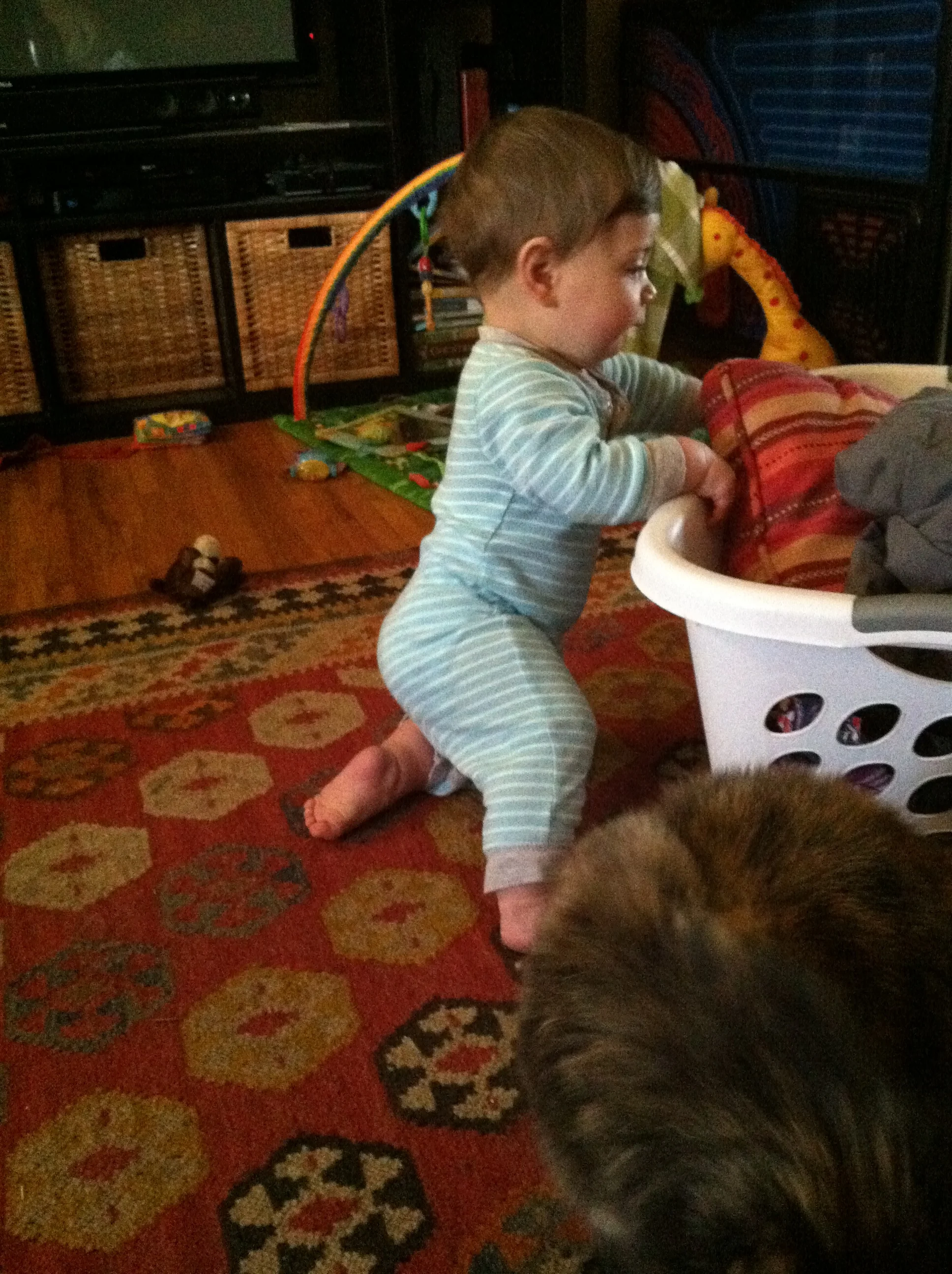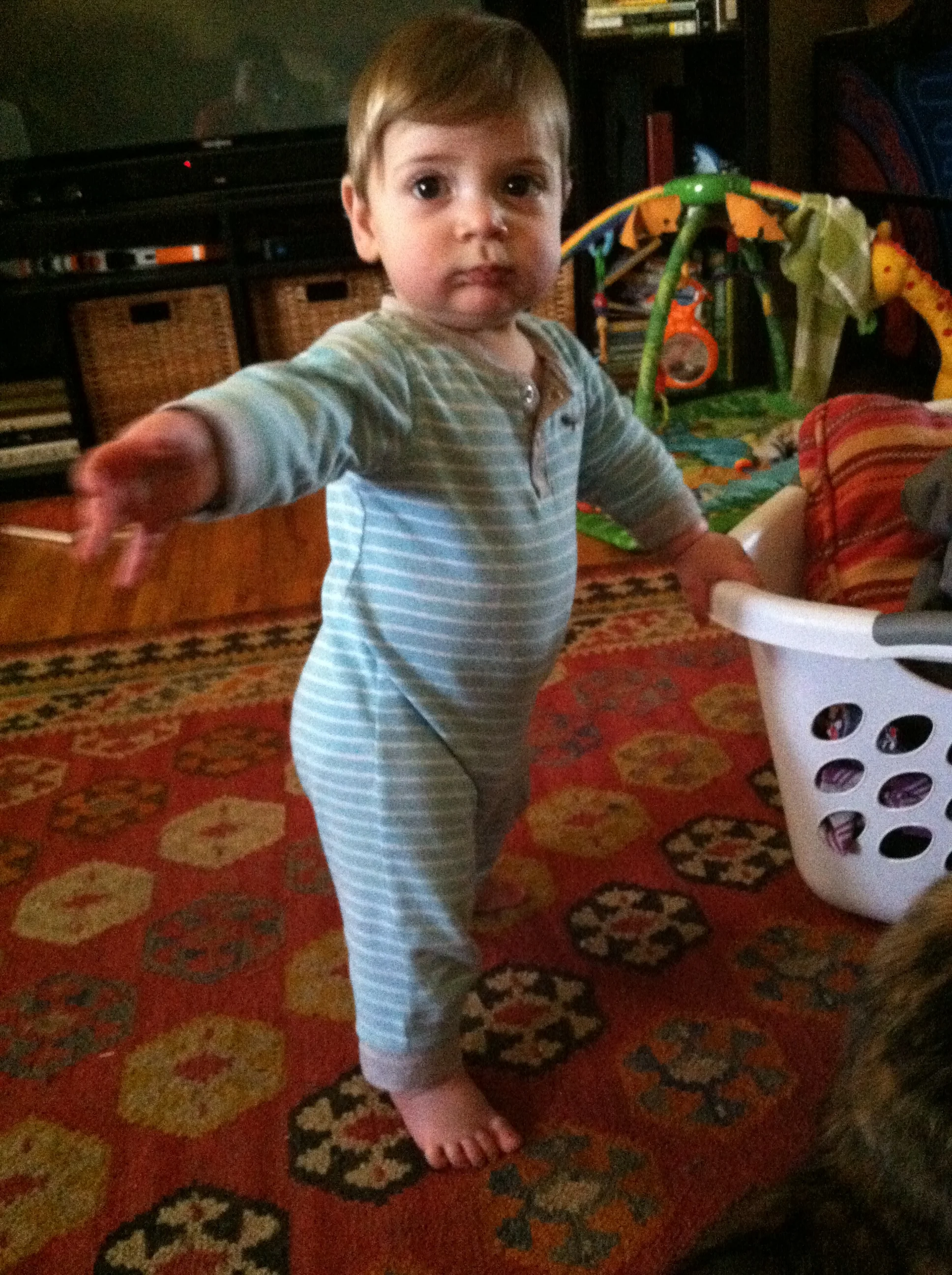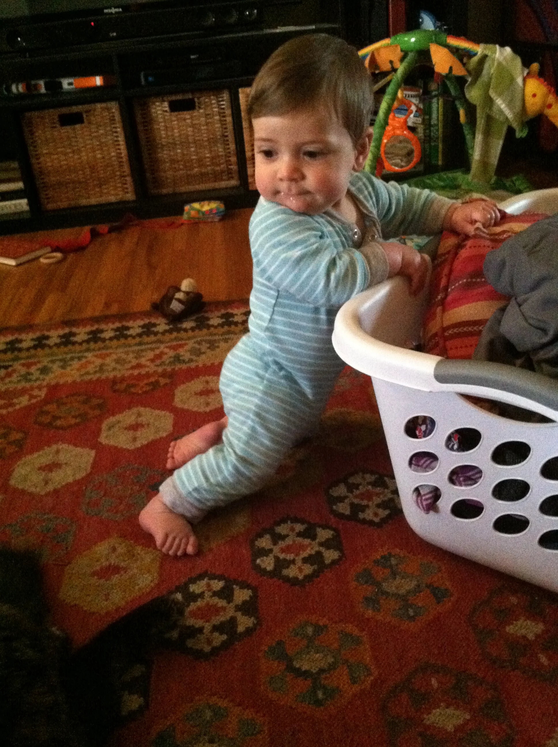 One day last week, when no one was watching, so no one was there to tell him "be careful" "no no Baby" "You might fall, Yoga Baby grabbed hold of the laundry basket and pulled himself up to standing.
