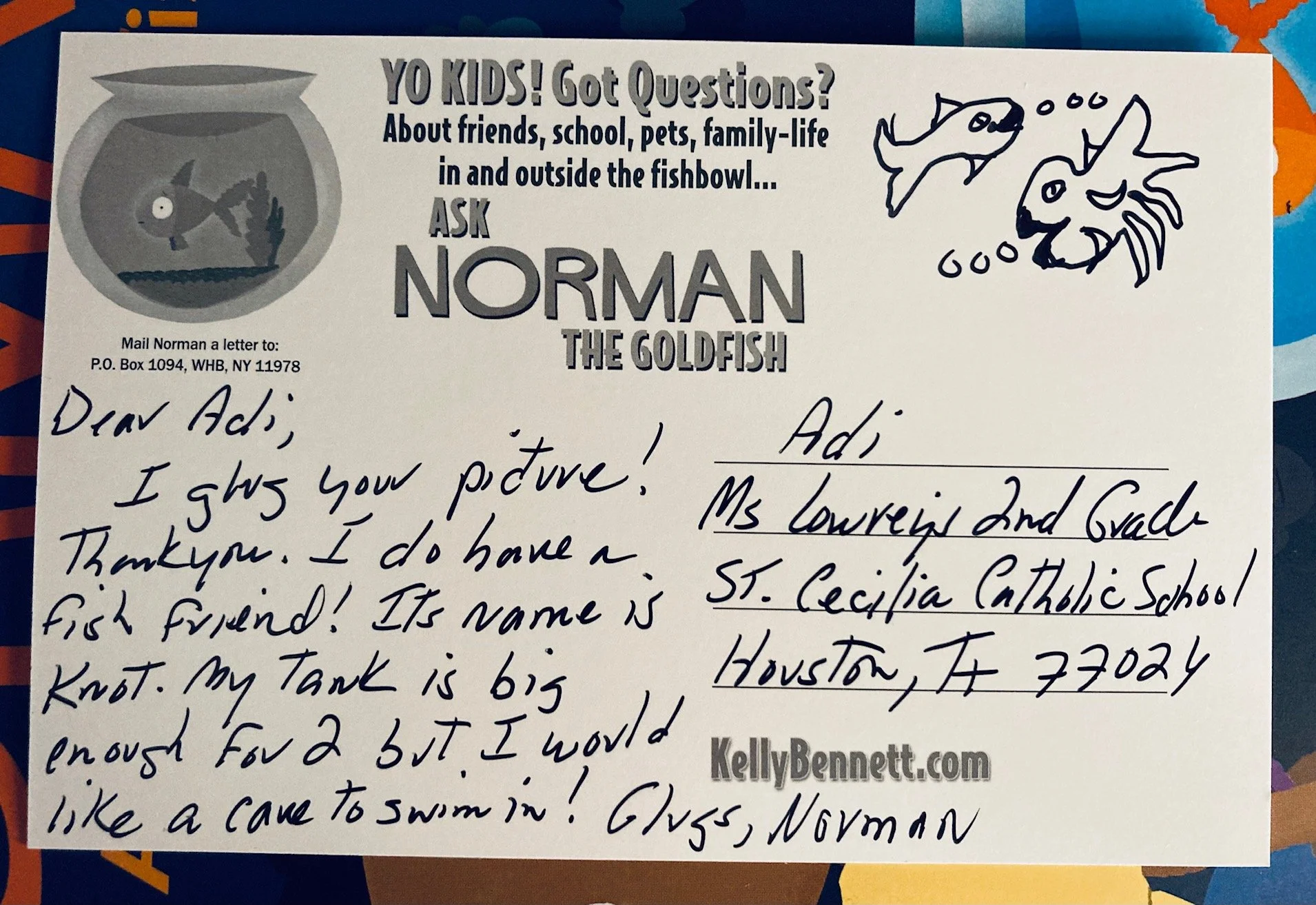 Fin Pal asks Norman "Need Help Decorating Your Tank"? Ask Norman Jul 22 Written By Kelly Bennett Ready to read Norman’s answer? Scroll down . . . GlugGlugGlug . . . But first a finny!Q: What type of music should you listen to whilst fishing? Q: What type of music should you listen to whilst fishing? A: Something Catch! Do you have a question for Norman the Goldfish- about friends, school, pets, family, life in and outside the fishbowl? Send him a letter! Here's how!! Don’t forget to order your copy of NOT NORMAN: A GOLDFISH STORY and NORMAN: ONE AMAZING GOLDFISH!! Grab Yours!! goldfish jokesletter writing 2nd gradeletter writing activitypenpal letter writing Kelly Bennett