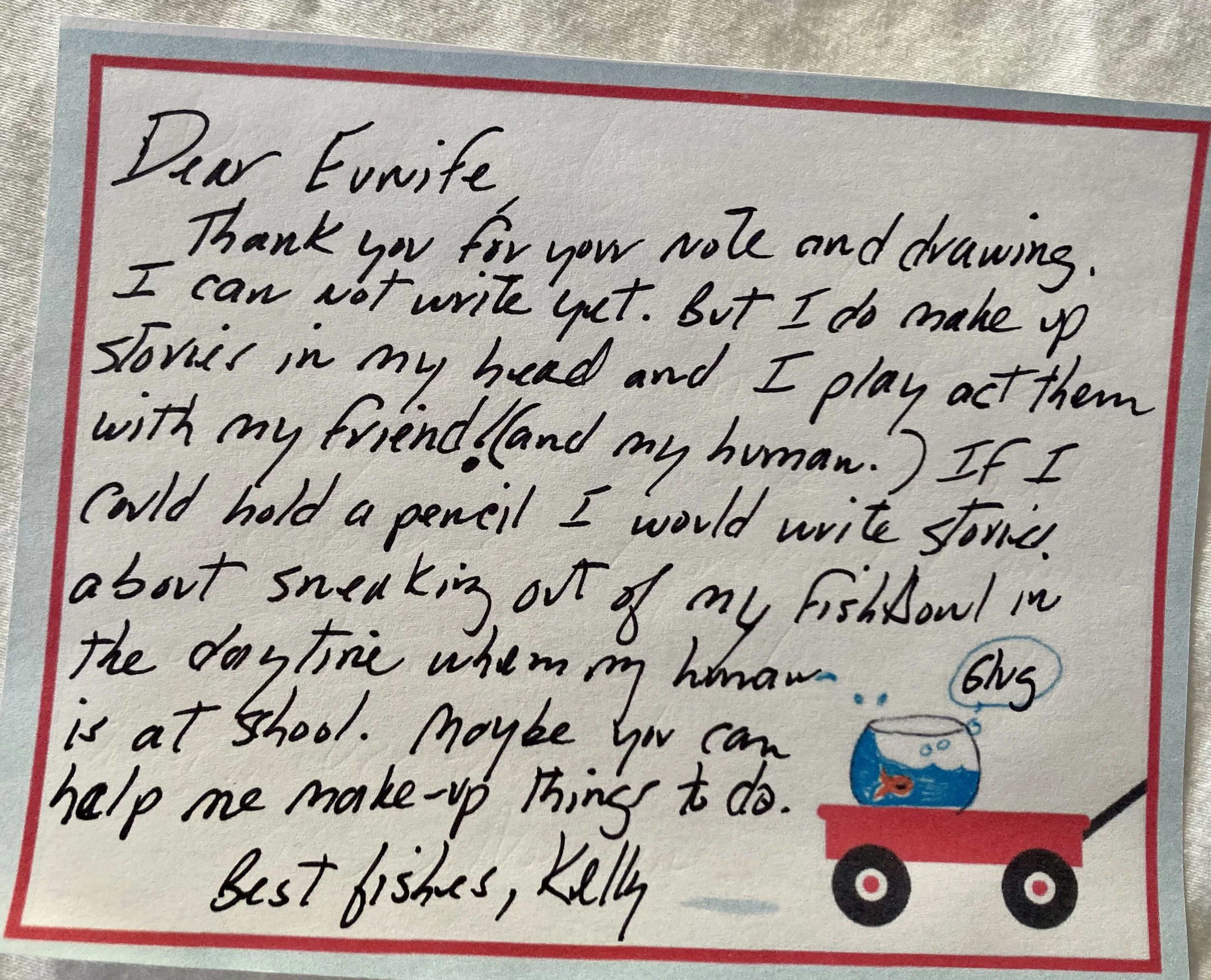 Norman is a made-up goldfish in her story. Norman is also a goldfish that lives at Kelly’s house. But, let me ask you: while Norman the goldfish is swimming around in his bowl, might he be imagining stories?